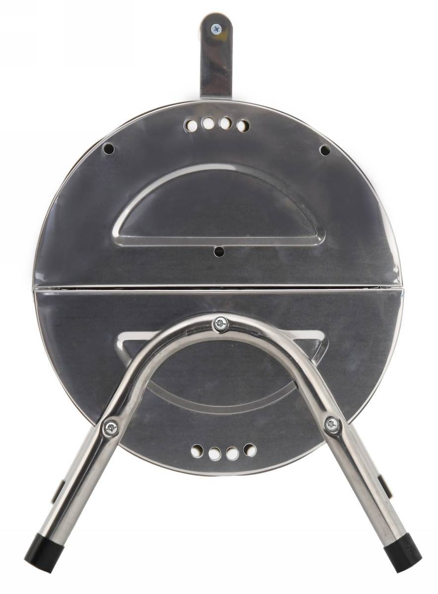 A szerkezet kiváló minőségű rozsdamentes acéllemezből készült, polírozott felülettel. A fa fogantyú biztosítja a készülék kényelmes hordozását. A stabilitást négy fémláb biztosítja, amelyek a grilltesthez vannak csavarozva.